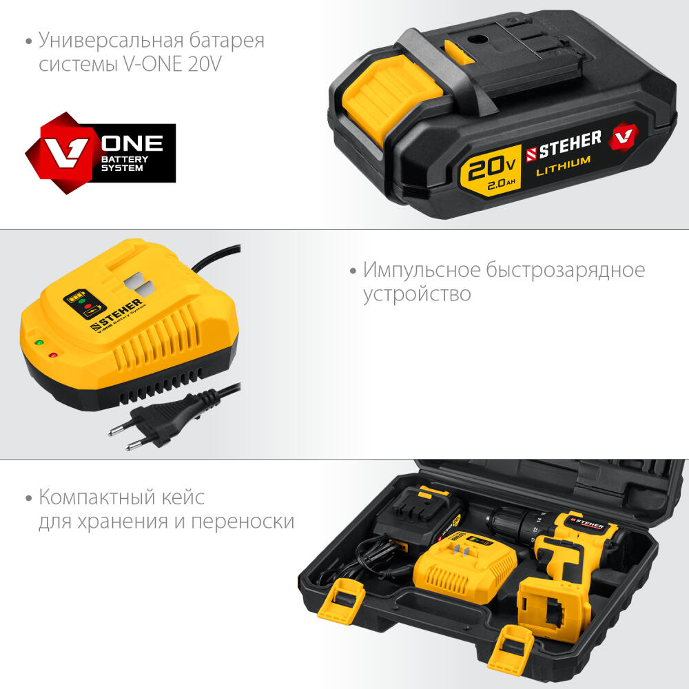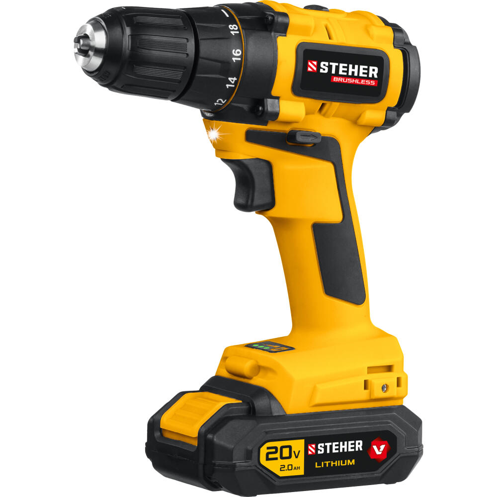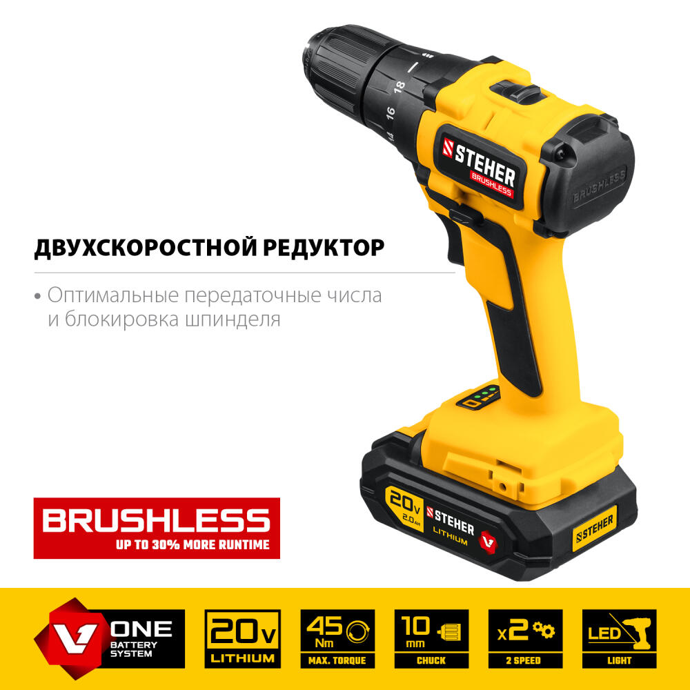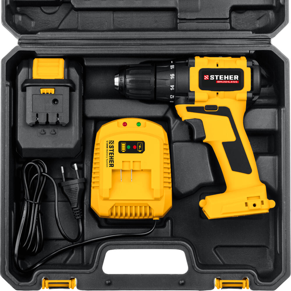 STEHER V1, 20 В, 45 Н·м, 1 АКБ (2 А·ч), бесщеточная дрель-шуруповерт, кейс (CDB-200-1)