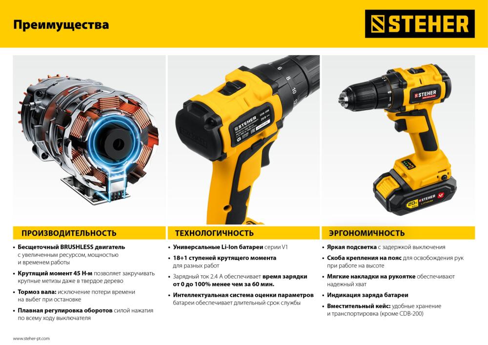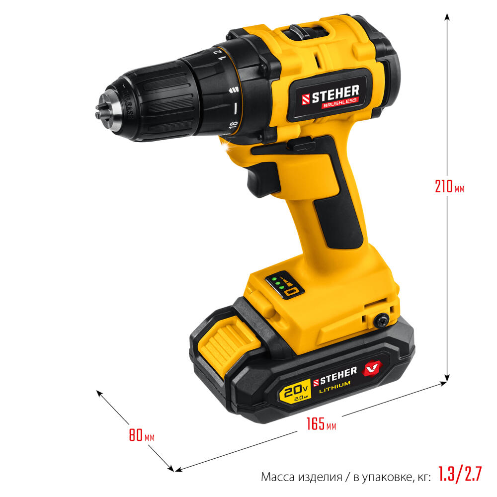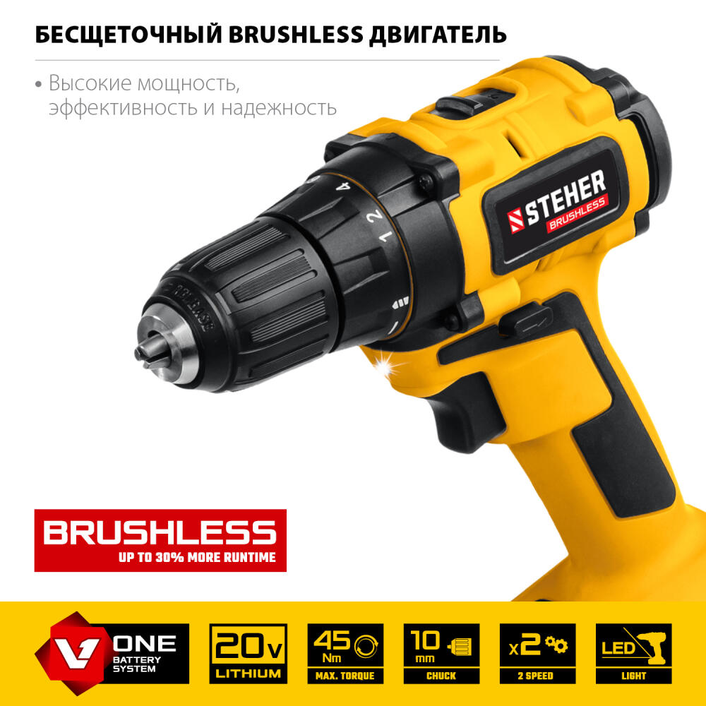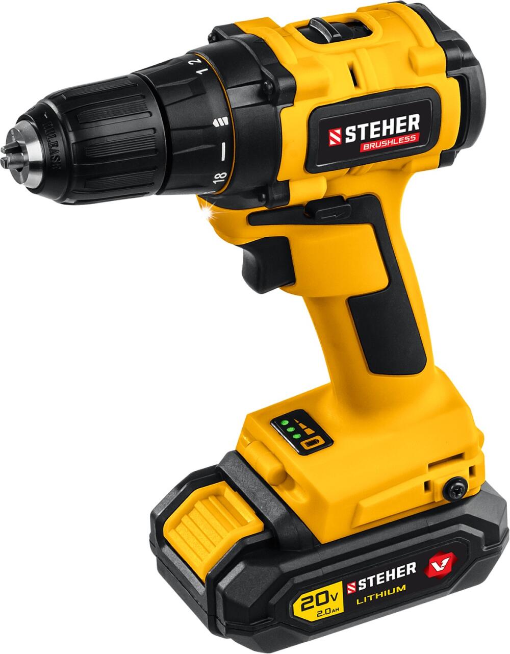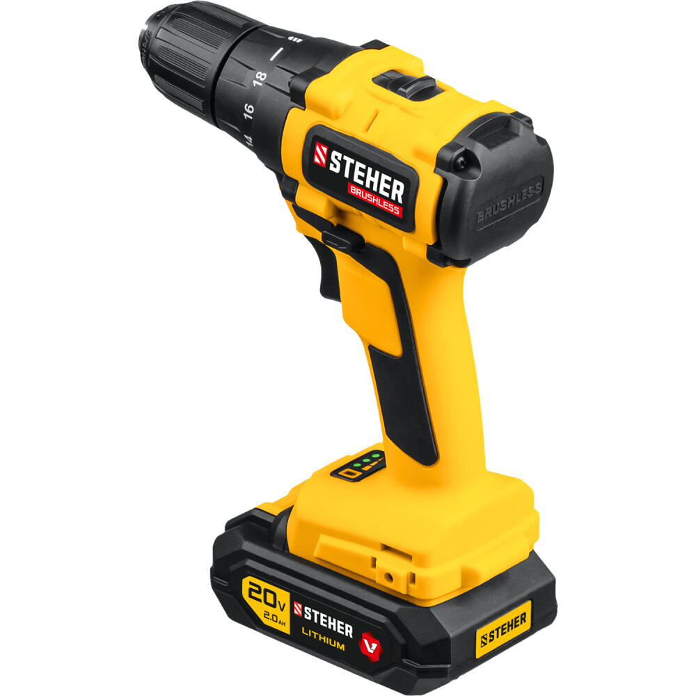STEHER V1, 20 В, 45 Н·м, 1 АКБ (2 А·ч), бесщеточная дрель-шуруповерт, кейс (CDB-200-1)