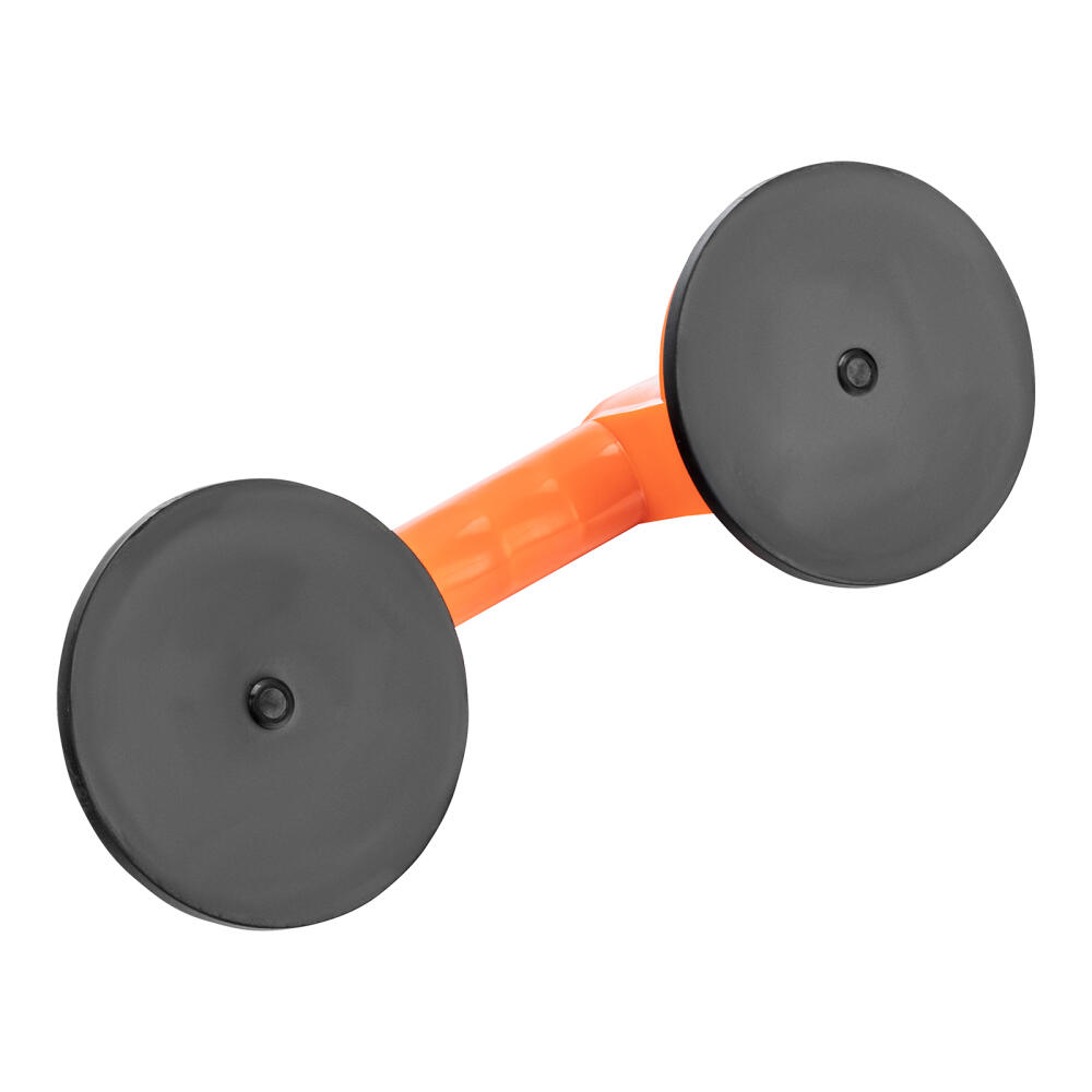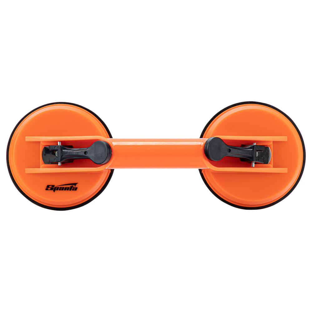 Двойной стеклодомкрат Sparta 875155 предназначен для удержания, переноски и установки зеркал, стекол, столешниц, кафельной плитки и других плоских гладких предметов массой до 80 кг. Две вакуумные присоски бережно, но надежно фиксируются на поверхности при помощи зажимов. Стеклодомкрат будет полезен во время проведения ремонта, а также пригодится в быту.
