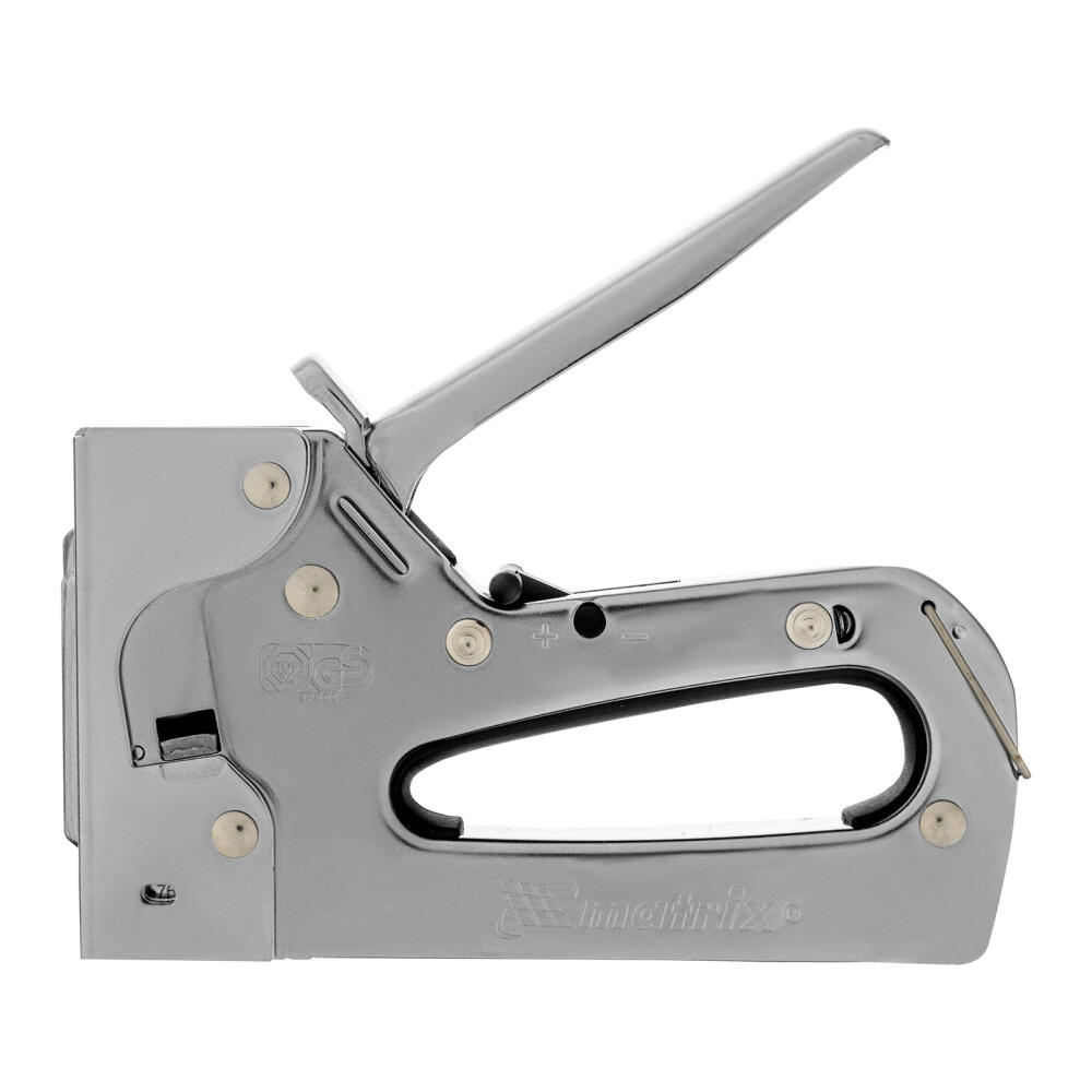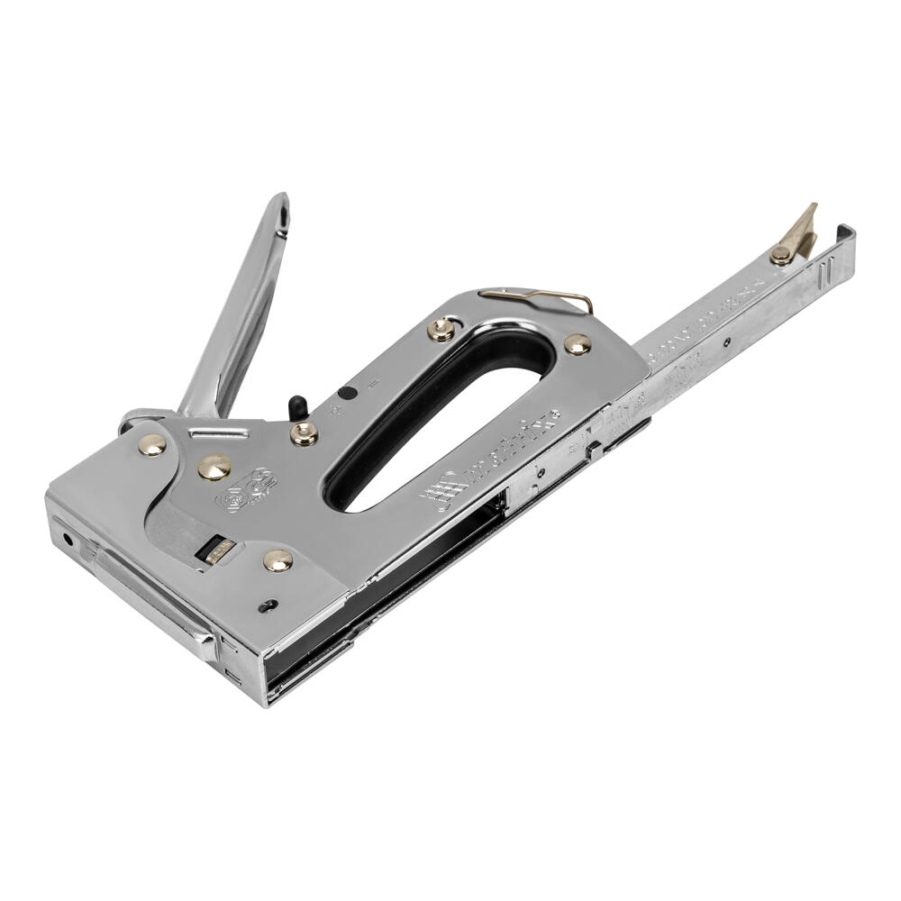 Металлический мебельный степлер Matrix Professional 40913 — инструмент с регулируемой мощностью удара, применяемый для закрепления листовых материалов на деревянных основаниях при помощи скоб типа 53 размером 6-14 мм. Подходит для работы с фанерой, оргалитом, ДВП, ДСП, пленкой и утеплителем. Продуманная конструкция позволяет быстро загружать скобы в скобоприемник, экономя время мастера. Рессорная пружина обеспечивает плавность работы. Степлер используют для сборки шкафов, обивки мягкой мебели, укладки ковровых покрытий и при выполнении прочих крепежных работ.