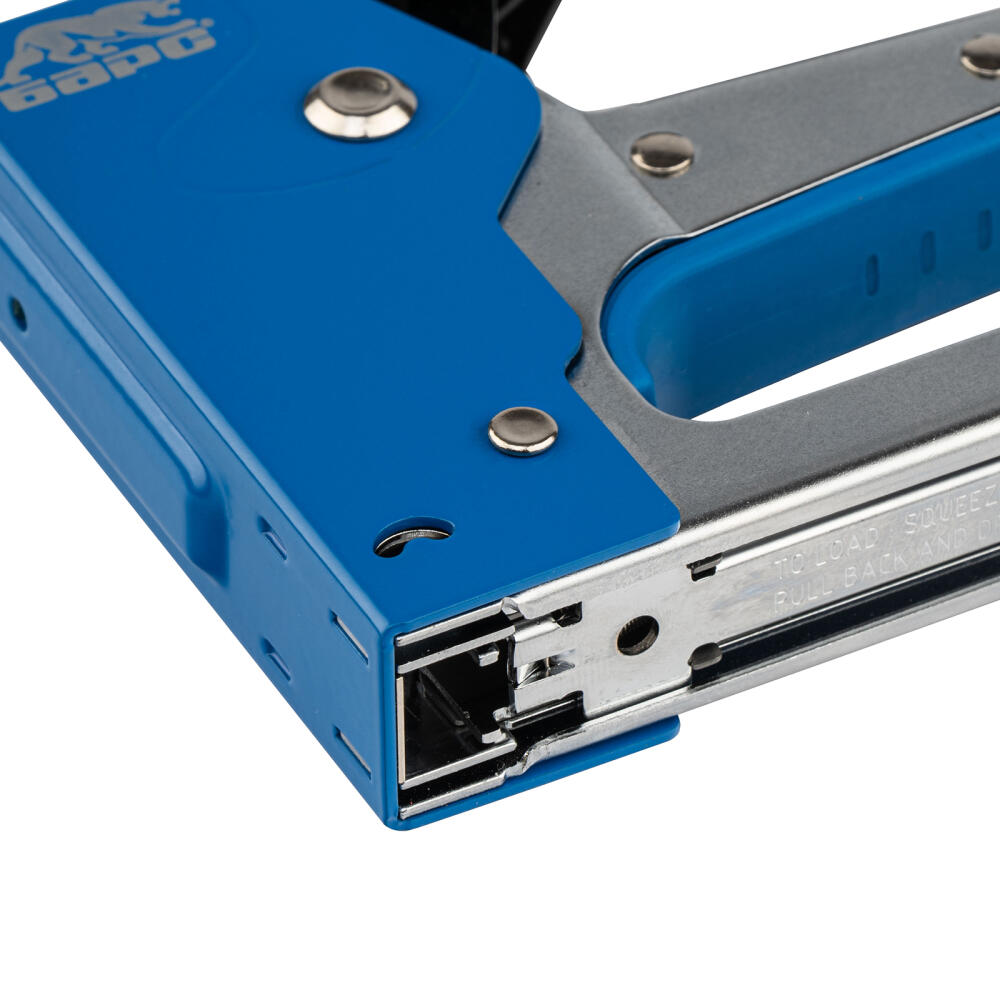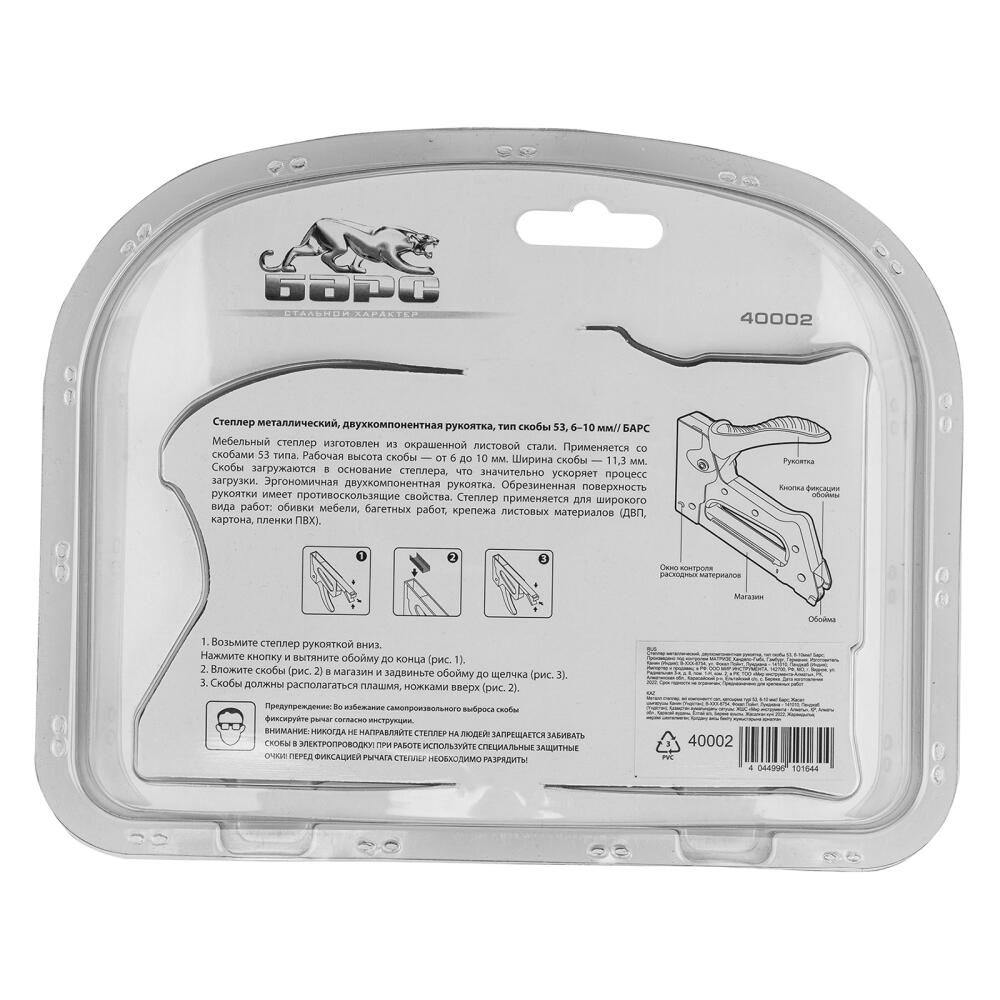 Металлический степлер Барс 40002 с двухкомпонентной рукояткой, для скоб типа 53 размером 6-10 мм, используется для сборки и обивки мебели, фиксации изоляционных материалов, а также других монтажных и отделочных работ. Позволяет быстро соединять с деревянным основанием листовые материалы из ДВП, ДСП, картона, оргалита, фанеры, пленки ПВХ. Благодаря рессорному ударному механизму инструмент не требует от оператора значительных усилий, поэтому подходит для длительной работы.