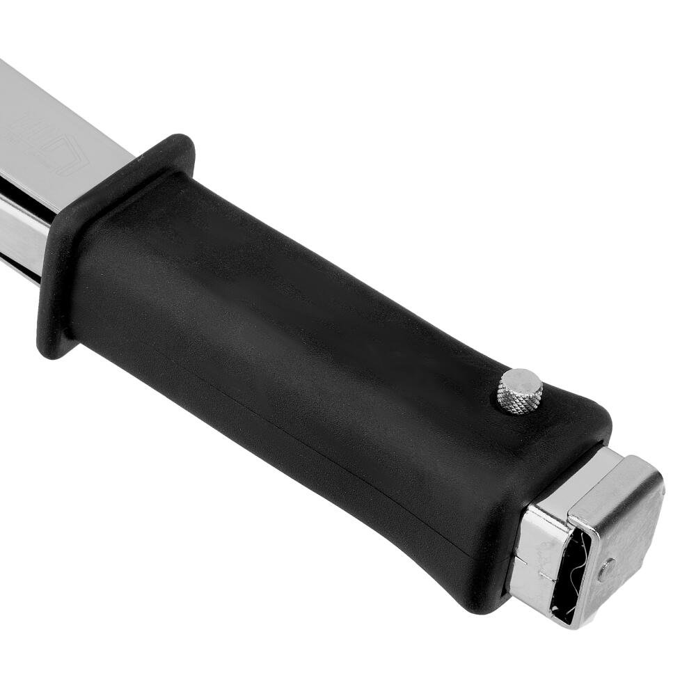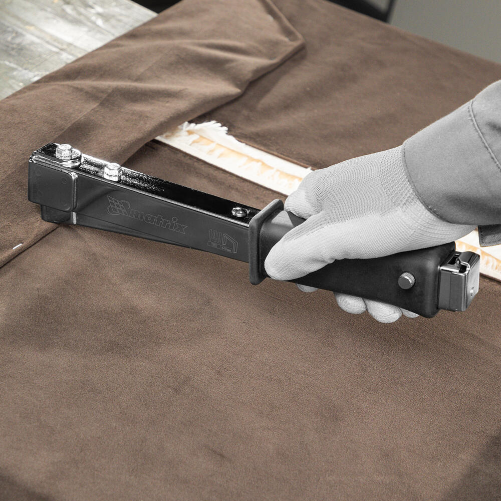 Усиленный степлер-молоток Matrix 40911 работает со скобами типа 140 размером 6-10 мм, оптимальными для крепления тонких листовых материалов и тканей. Используется для укладки кровельных и изоляционных материалов, а также ковровых покрытий. Применение степлера-молотка позволяет значительно ускорить выполнение строительных и отделочных работ.