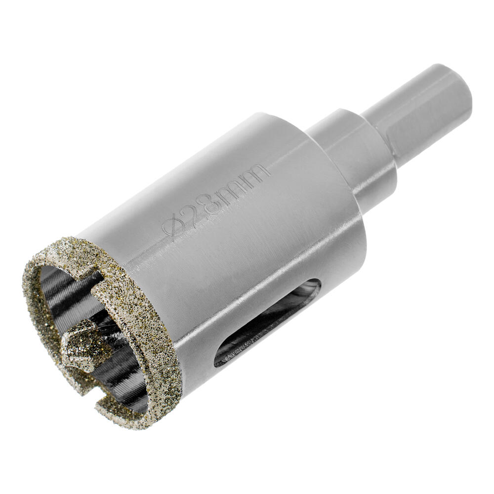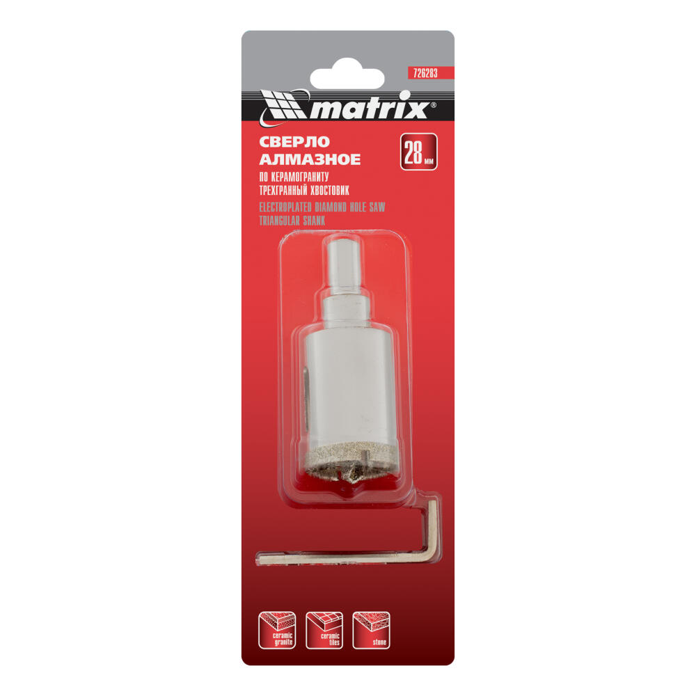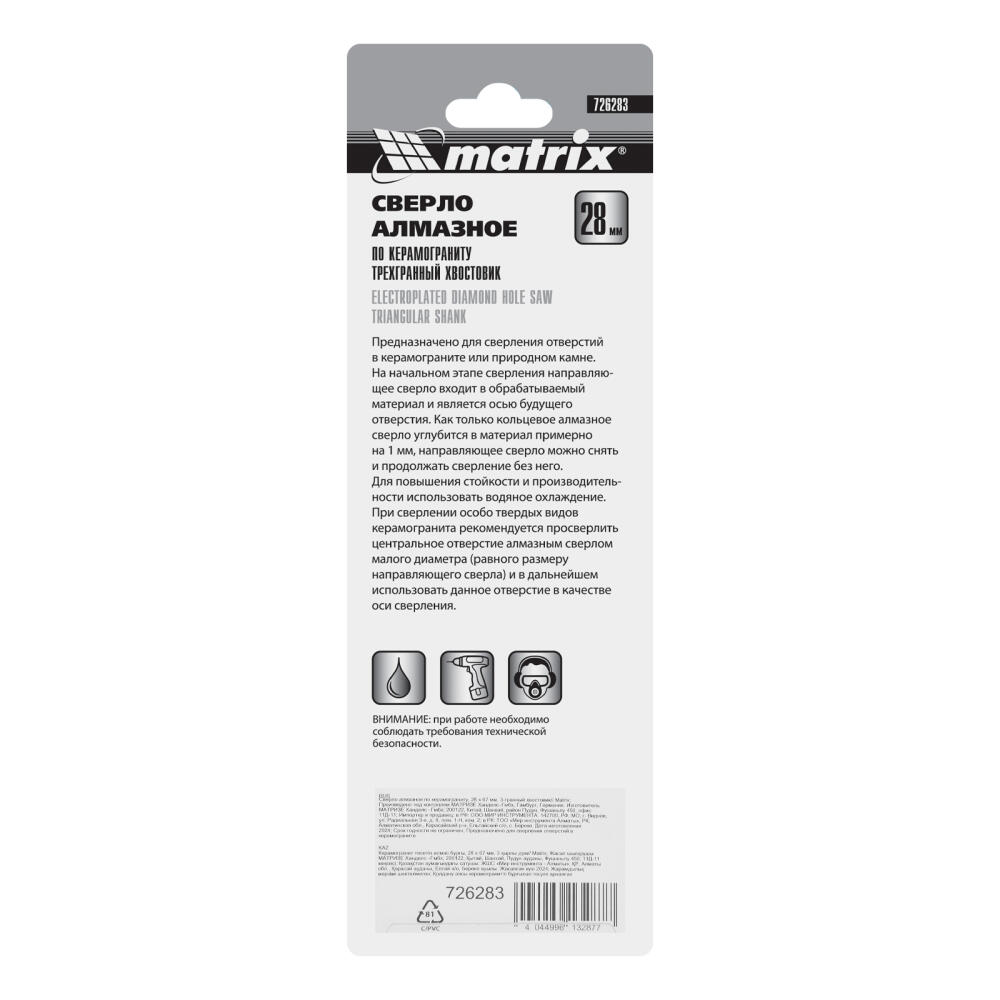 Универсальное алмазное сверло по керамограниту Matrix 726283 размером 28 х 67 мм, с 3-гранным хвостовиком, применяется для получения отверстий в стекле, плитке, кафеле. За счет высокой концентрации алмазов в режущем слое оно легко справляется со сверлением керамогранита. Сверло рассчитано на профессиональное использование с дрелями и шуруповертами. Водяное охлаждение в процессе работы значительно повышает срок службы оснастки.