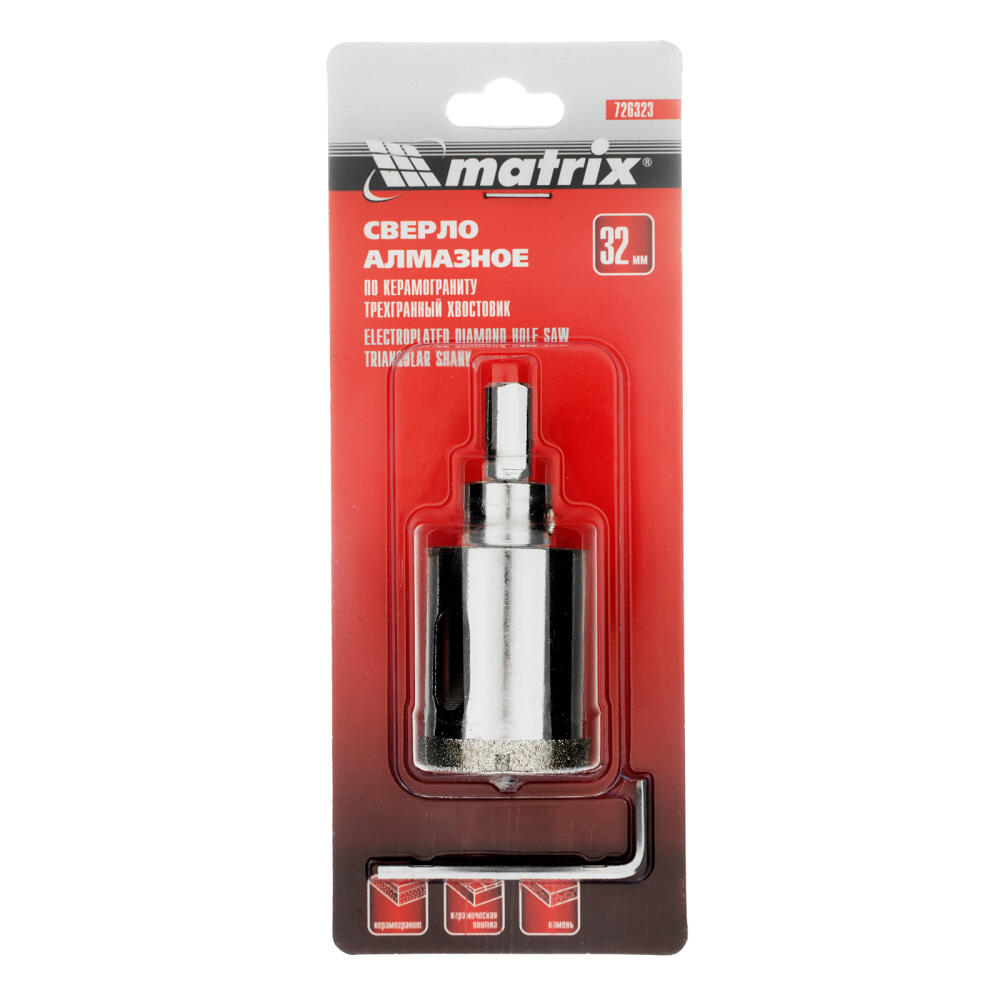 Универсальное алмазное сверло по керамограниту Matrix 726323 размером 32 х 67 мм, с 3-гранным хвостовиком, применяется для получения отверстий в стекле, плитке, кафеле. За счет высокой концентрации алмазов в режущем слое оно легко справляется со сверлением керамогранита. Сверло рассчитано на профессиональное использование с дрелями и шуруповертами. Водяное охлаждение в процессе работы значительно повышает срок службы оснастки.