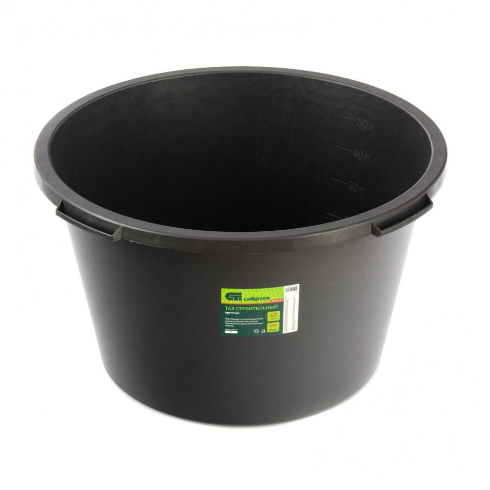 Круглый строительный таз Сибртех 814415 объемом 60 л используется для приготовления штукатурных, шпаклевочных, красящих, клеевых растворов при проведении ремонтных и отделочных работ. Пригодится таз и в быту — в нем удобно хранить и перемещать сыпучие материалы.