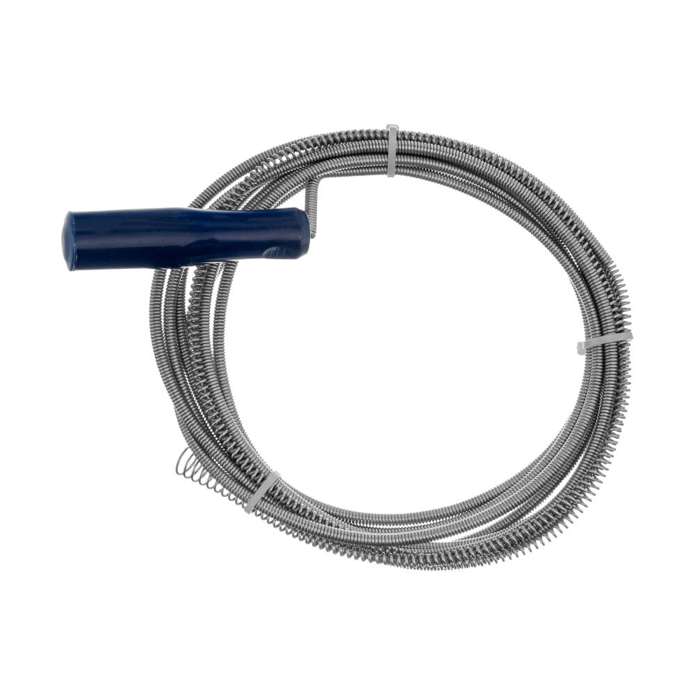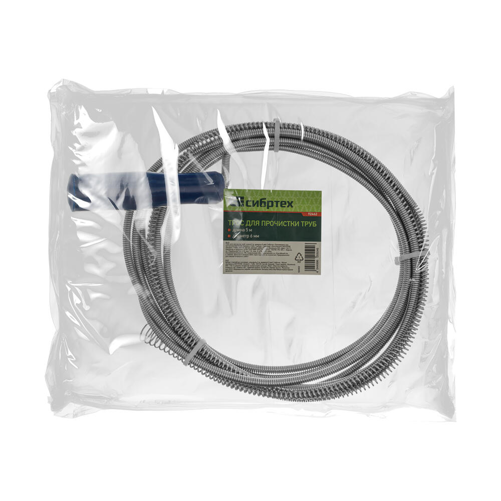 Трос для прочистки труб Сибртех 92462 длиной 5 м и диаметром 6 мм успешно справляется с засорами в канализационных трубах, вызванными скоплением шерсти, волос, жировых отложений. Представляет собой прочную и долговечную спираль с сердечником. Используется в быту.