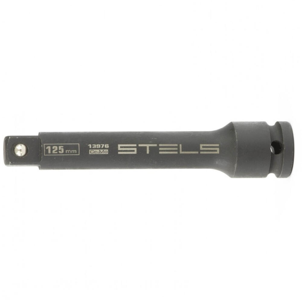 Ударный удлинитель Stels 13976 длиной 125 мм, с посадочным местом и присоединительным квадратом 1/2", используется для проведения монтажа и демонтажа резьбового крепежа в малодоступных местах. Будет полезен на предприятии автосервиса и в слесарной мастерской.