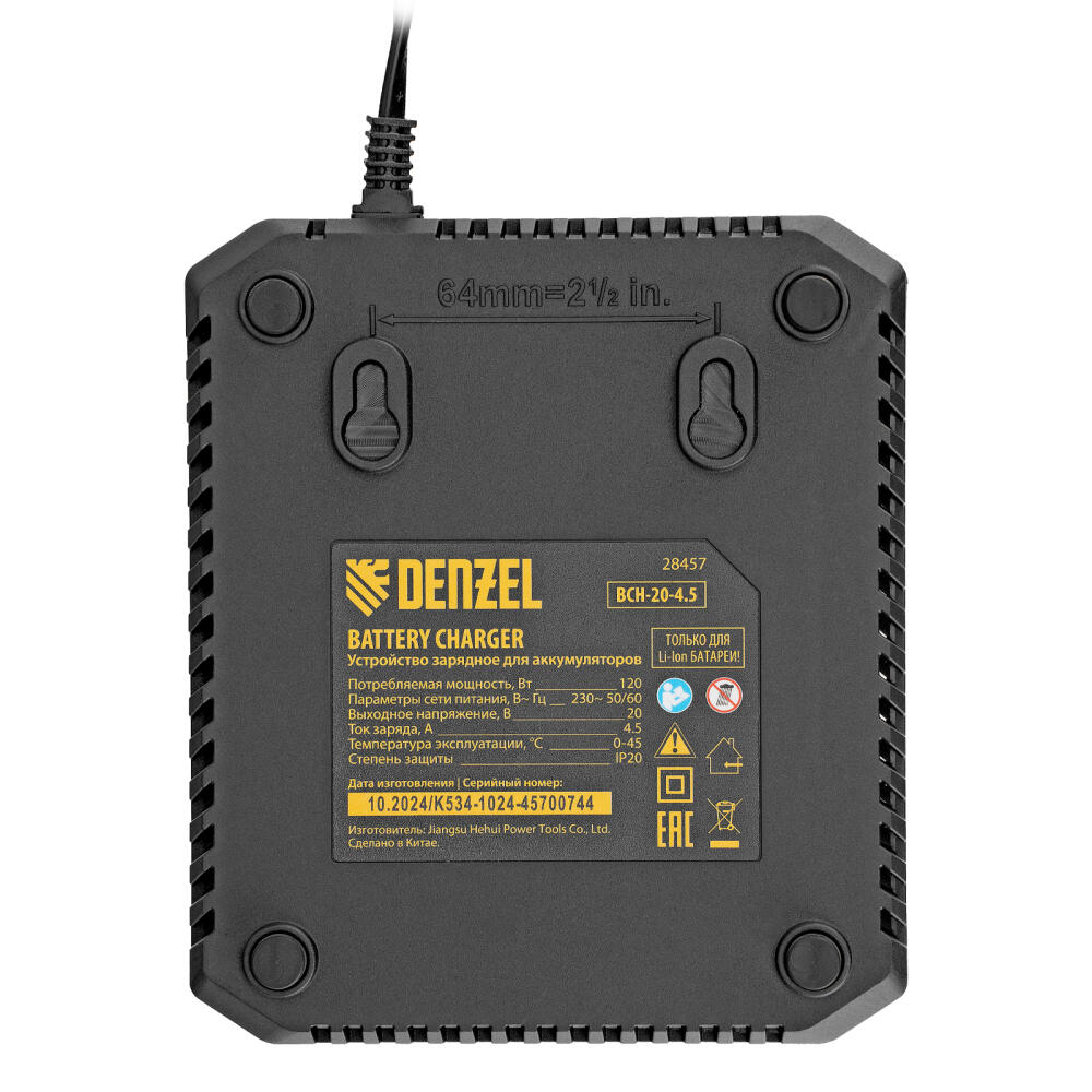 Зарядное устройство Denzel BCH-20-4.5 28457 предназначено для восстановления работоспособности Li-Ion аккумуляторов единой платформы Denzel Power System 20 V (артикулы 28442, 28444 и 28446). Поддерживает ток заряда 4,5 A. Обеспечивает ускоренную и полную зарядку, что позволяет быстро вернуться к работе с аккумуляторным инструментом. Длина кабеля составляет 1,2 м, поэтому зарядное устройство удобно подключать к розетке.