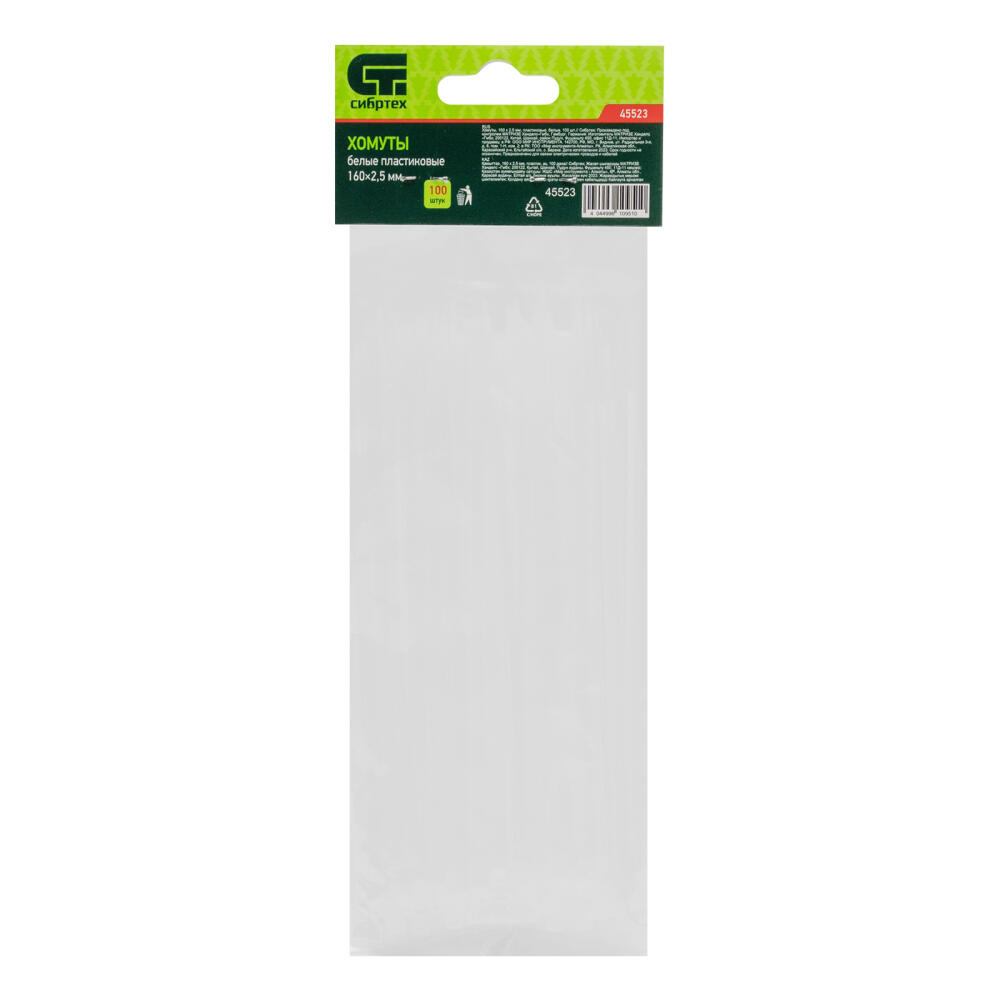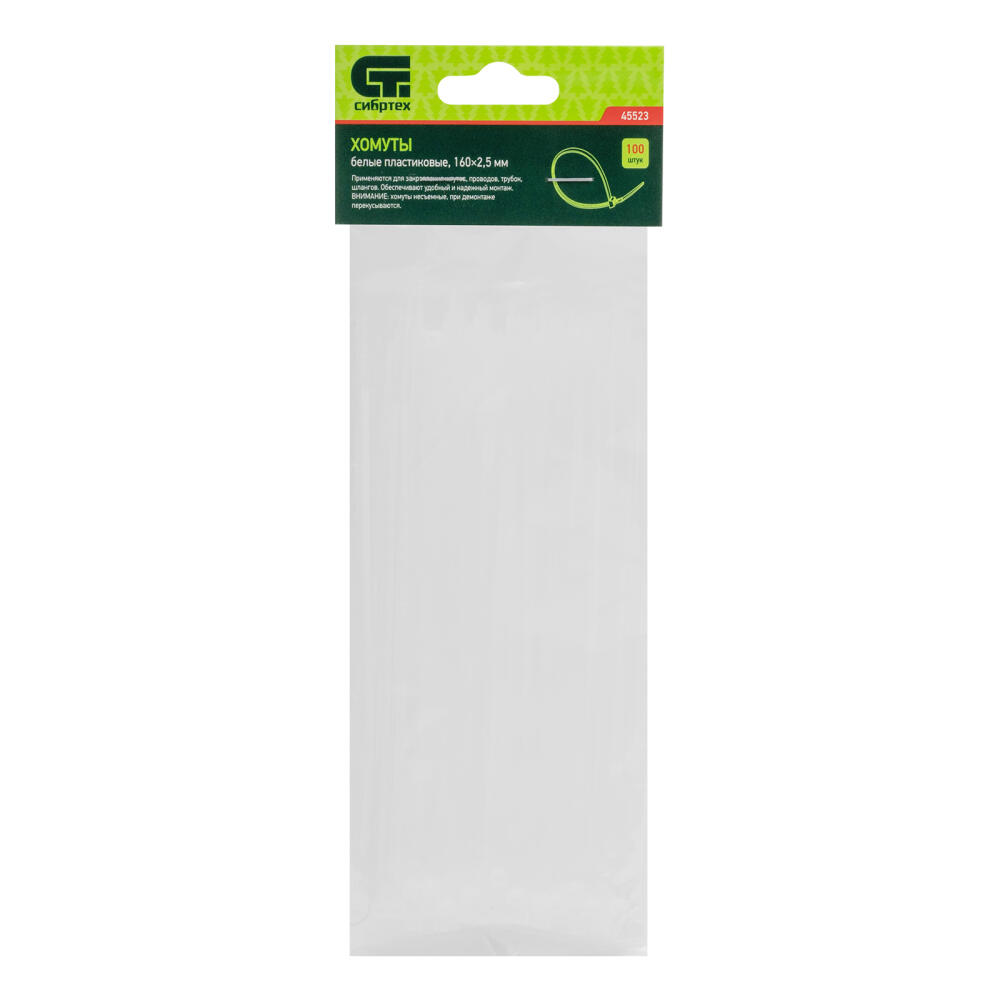 Белые пластиковые хомуты Сибртех 45523, 160 х 2,5 мм, 100 шт. в упаковке, используются для стяжки кабелей, закрепления трубок, шлангов, рекламных конструкций, а также для упаковки различных предметов. Пригодятся во время прокладки электрических и локальных вычислительных сетей, ремонта компьютерной техники, оформлении торговых стендов, комплектовании товара, будут также полезны дома, на даче и в гараже.