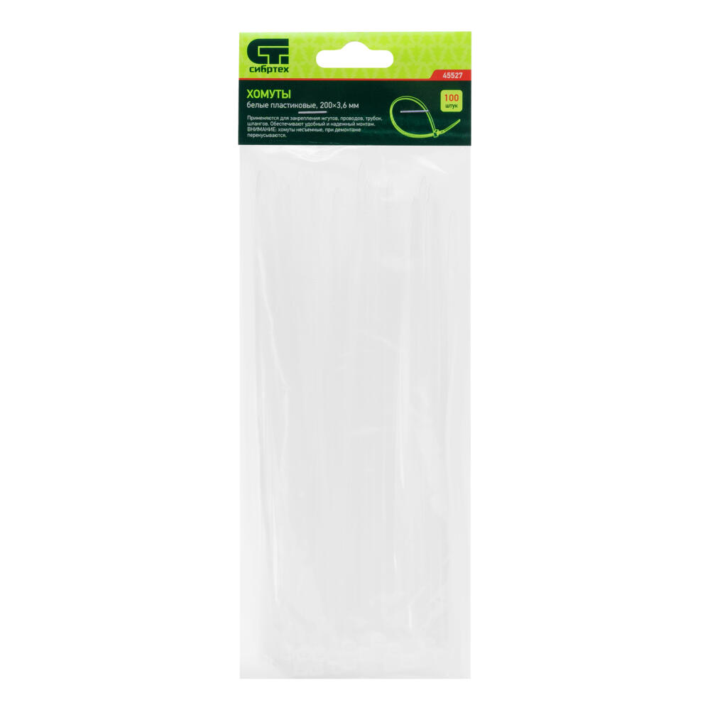 Белые пластиковые хомуты Сибртех 45527, 200 х 3,6 мм, 100 шт. в упаковке, используются для стяжки кабелей, закрепления трубок, шлангов, рекламных конструкций, а также для упаковки различных предметов. Пригодятся во время прокладки электрических и локальных вычислительных сетей, ремонта компьютерной техники, оформлении торговых стендов, комплектовании товара, будут также полезны дома, на даче и в гараже.