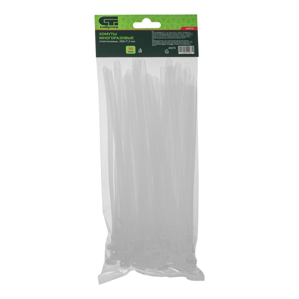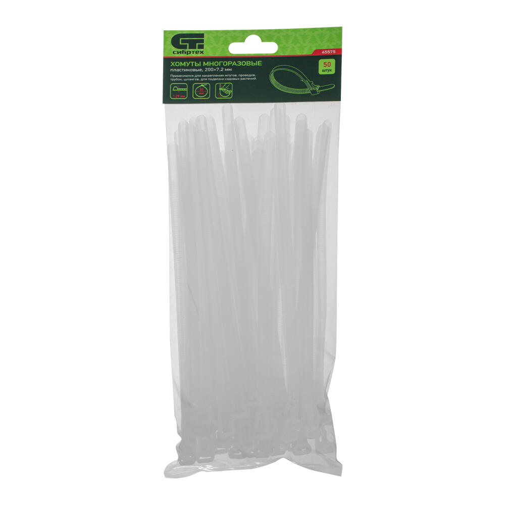 Пластиковые многоразовые хомуты Сибртех 45575 размером 200 х 7,2 мм, 50 шт. в упаковке, — приспособления для стяжки кабелей, шлангов или трубок. Могут применяться для подвязки растений или упаковки предметов. Белые пластиковые стяжки пригодятся во время выполнения электромонтажных работ, ремонта техники, будут полезны в промышленности, торговле, а также в быту.