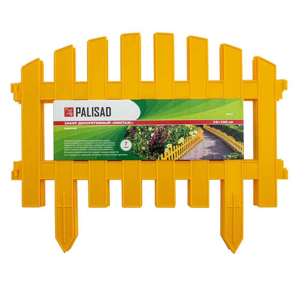 Желтый декоративный забор Palisad «Винтаж» 65010 размером 28 х 300 см, предназначен для зонирования территории. Состоит из 7 оригинальных секций общей длиной 300 см. С их помощью можно оформить клумбу, дорожку или зону отдыха, огородить грядки, деревья или кусты. Забор придаст законченный вид территории дачного участка.