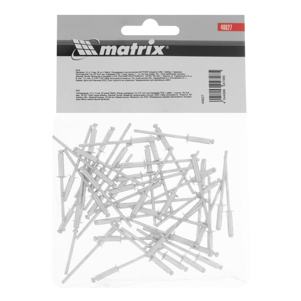 Заклепки Matrix 40627 размером 3,2 х 12 мм, 50 шт. в упаковке, предназначены для соединения листовых заготовок. Обеспечивают надежную фиксацию материалов даже при наличии доступа только с одной стороны. Используются в строительстве домов, для возведения заборов из профлиста, при производстве оборудования, будут полезны в домашней мастерской.