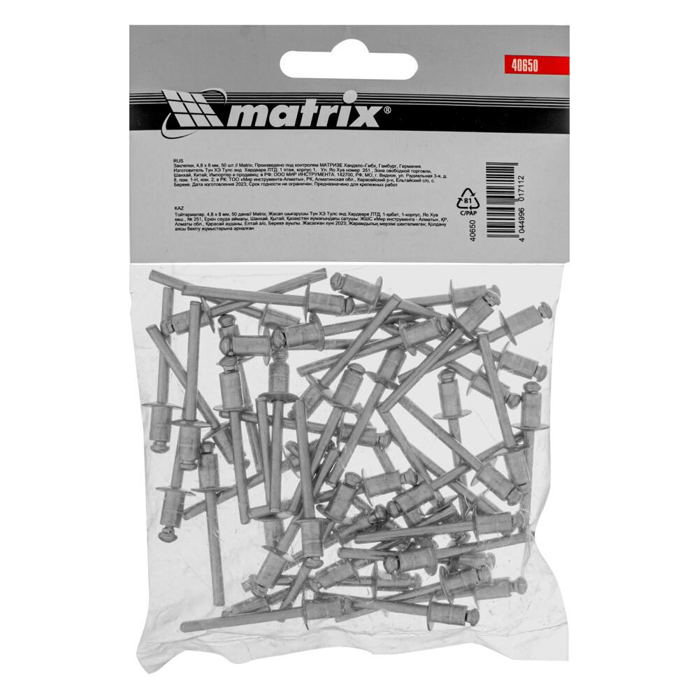 Заклепки Matrix 40650 размером 4,8 х 8 мм, 50 шт. в упаковке, предназначены для соединения листовых заготовок. Обеспечивают надежную фиксацию материалов даже при наличии доступа только с одной стороны. Используются в строительстве домов, для возведения заборов из профлиста, при производстве оборудования, будут полезны в домашней мастерской.
