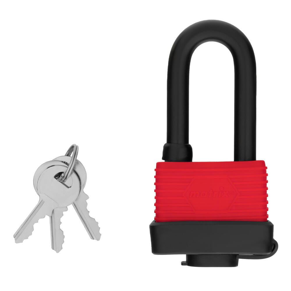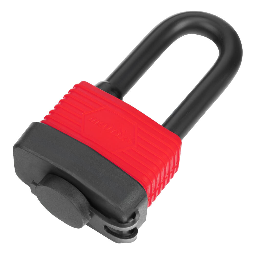 Навесной всепогодный замок Matrix 91826 шириной 50 мм, с удлиненной дужкой, вешается на дверь и обеспечивает сохранность имущества. Поможет защитить от несанкционированного проникновения сарай, гараж, подвал и другие помещения, подходит для высоких запорных петель.