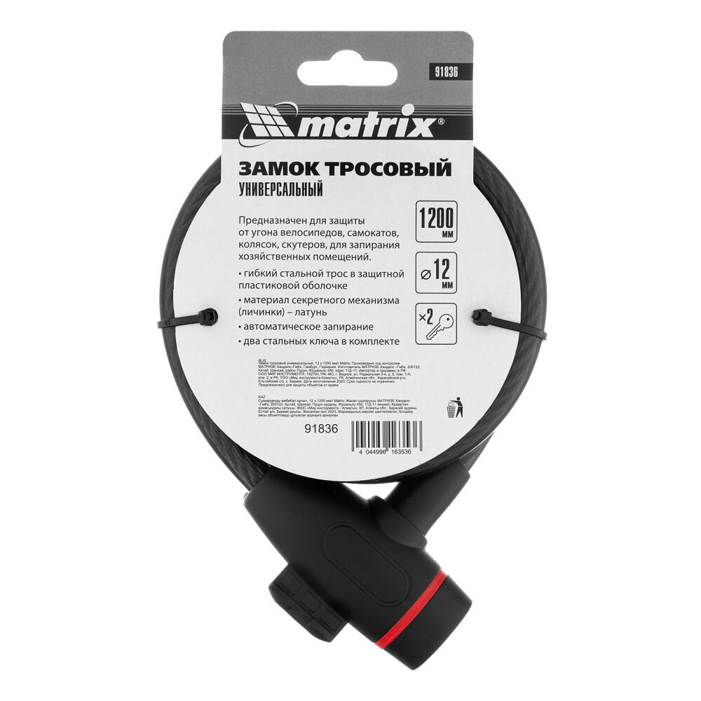 Универсальный тросовый замок Matrix 91836 размером 12 х 1200 мм позволяет обезопасить имущество от кражи. С его помощью можно пристегнуть велосипед, мопед, коляску и другие транспортные средства к неподвижной опоре, а также защитить помещение от взлома.