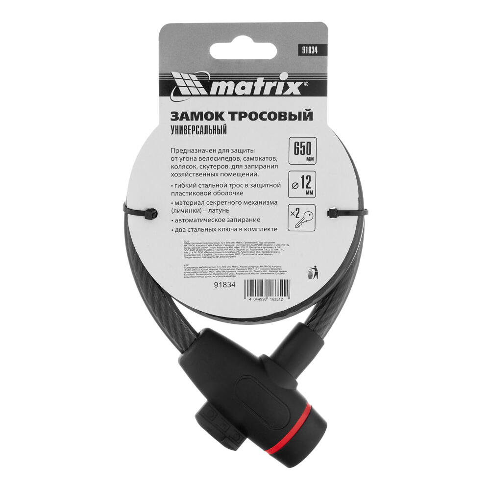 Универсальный тросовый замок Matrix 91834 размером 12 х 650 мм позволяет обезопасить имущество от кражи. С его помощью можно пристегнуть велосипед, мопед, коляску и другие транспортные средства к неподвижной опоре, а также защитить помещение от взлома.