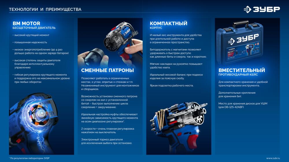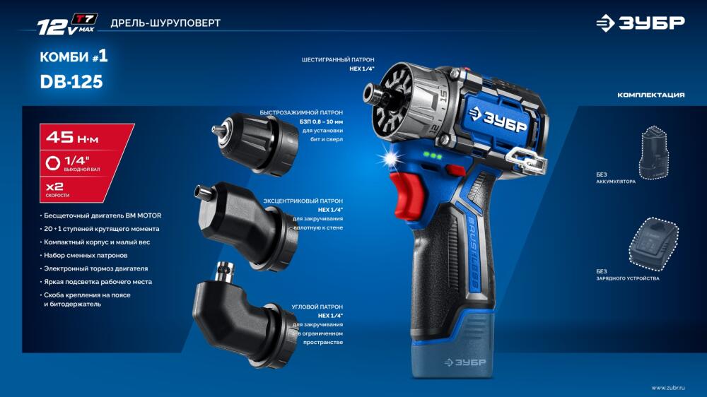 Высокотехнологичный шуруповерт профессионального уровня с передовым BRUSHLESS двигателем. Удобный инструмент с набором сменных патронов, крутящим моментом 45 Нм и компактной конструкцией для сборки мебели, ремонта оборудования, комплектации силовых шкафов и т.д.